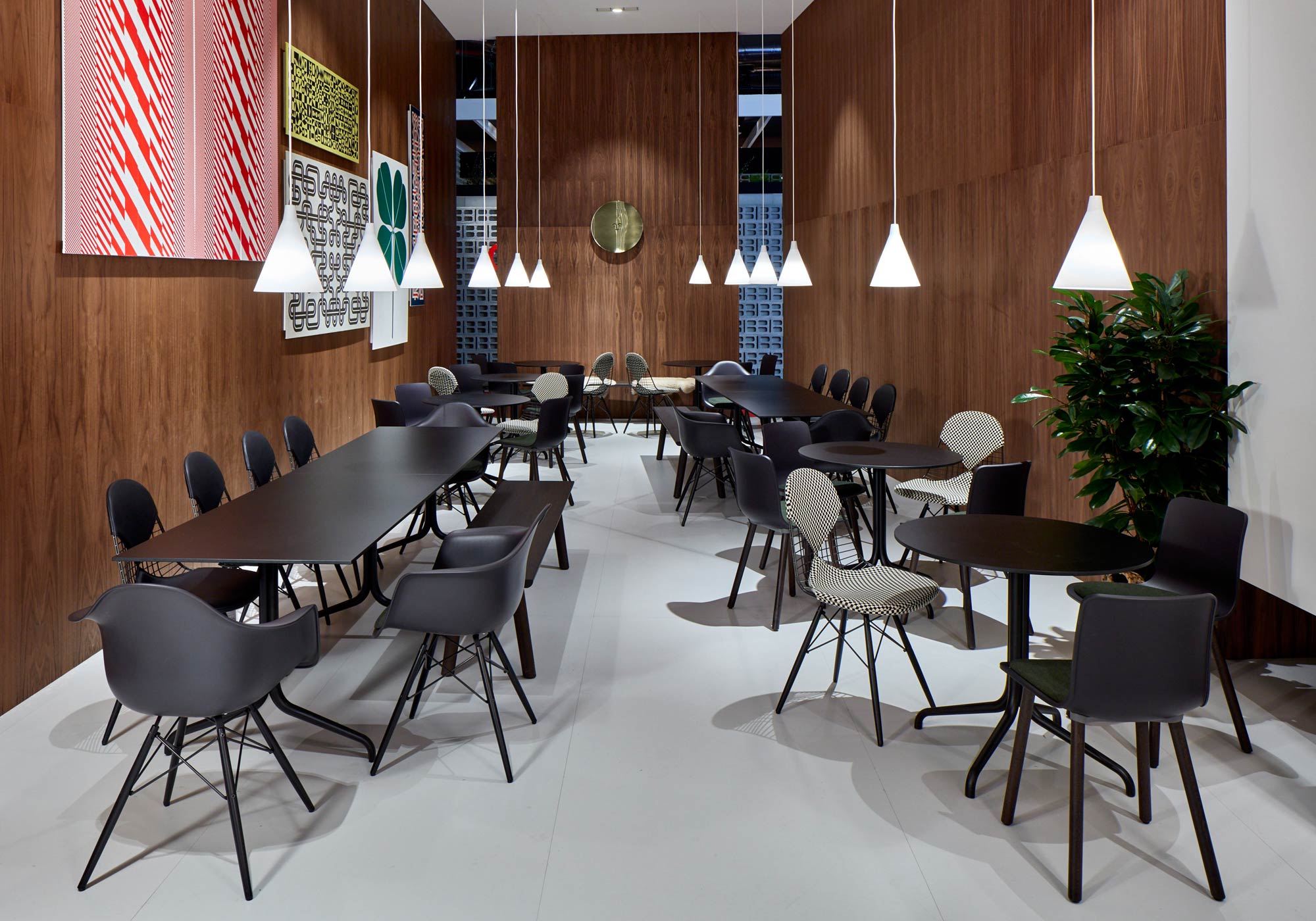 So there are 14 seat colours and several colours of wooden and metal bases. This makes for a virtually infinite number of combinations, which is further complemented by the fact that the plastic seat cushions can also be made with upholstery in countless fabric and leather colours. In addition, Vitra has made slight adjustments to the dimensions of the chairs in the past year to make them even more comfortable and to better match current seating requirements.