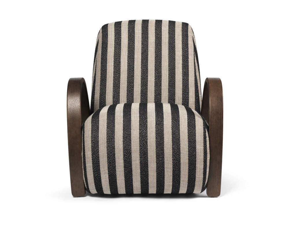 Comfortable Buur Lounge Chair with distinctive rounded armrests from Danish brand Ferm Living. Version: sand/black Louisiana fabric upholstery.