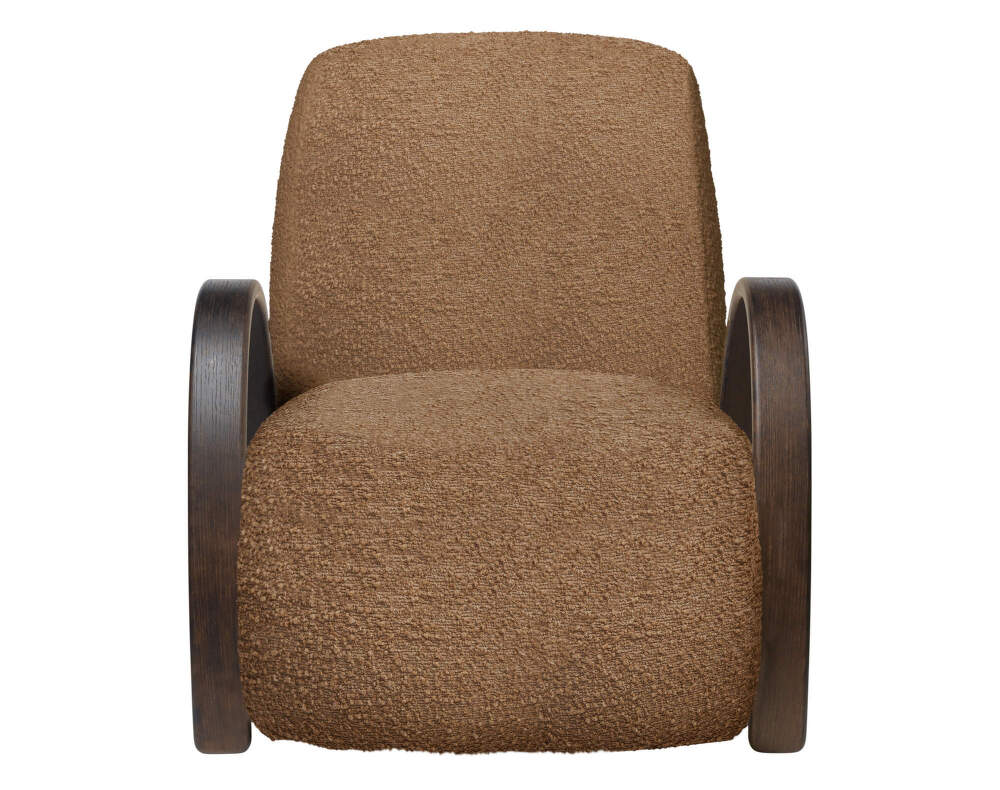 Comfortable Buur Lounge Chair with distinctive rounded armrests from Danish brand Ferm Living. Version: tan Raw Bouclé fabric upholstery.