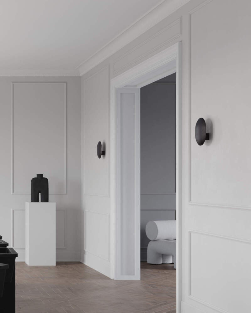The Clam wall lamp is available in several additional finishes and may be installed individually or combined with multiple units to create a harmonious lighting composition.