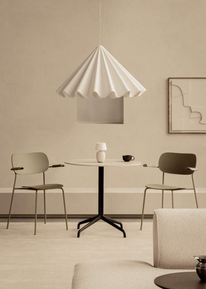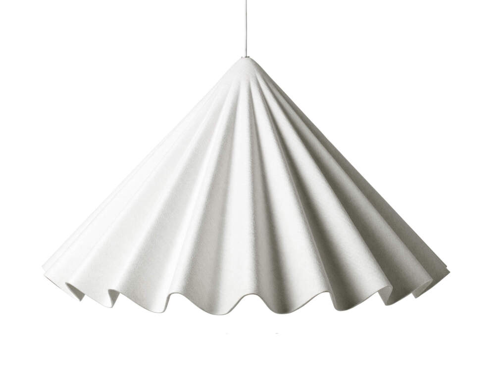 The shade is made from recycled polyester felt produced from used plastic bottles. The material is lightweight and durable, and it also helps absorb sound, contributing to better room acoustics.