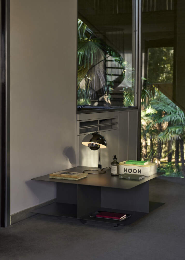The Develius table is made from precisely formed steel with a subtly textured powder-coated finish. Its elegantly clean construction remains understated while offering a high level of everyday functionality. The integrated storage compartment is accessible from all sides and partially concealed, helping to maintain a calm and organised look within the living space.