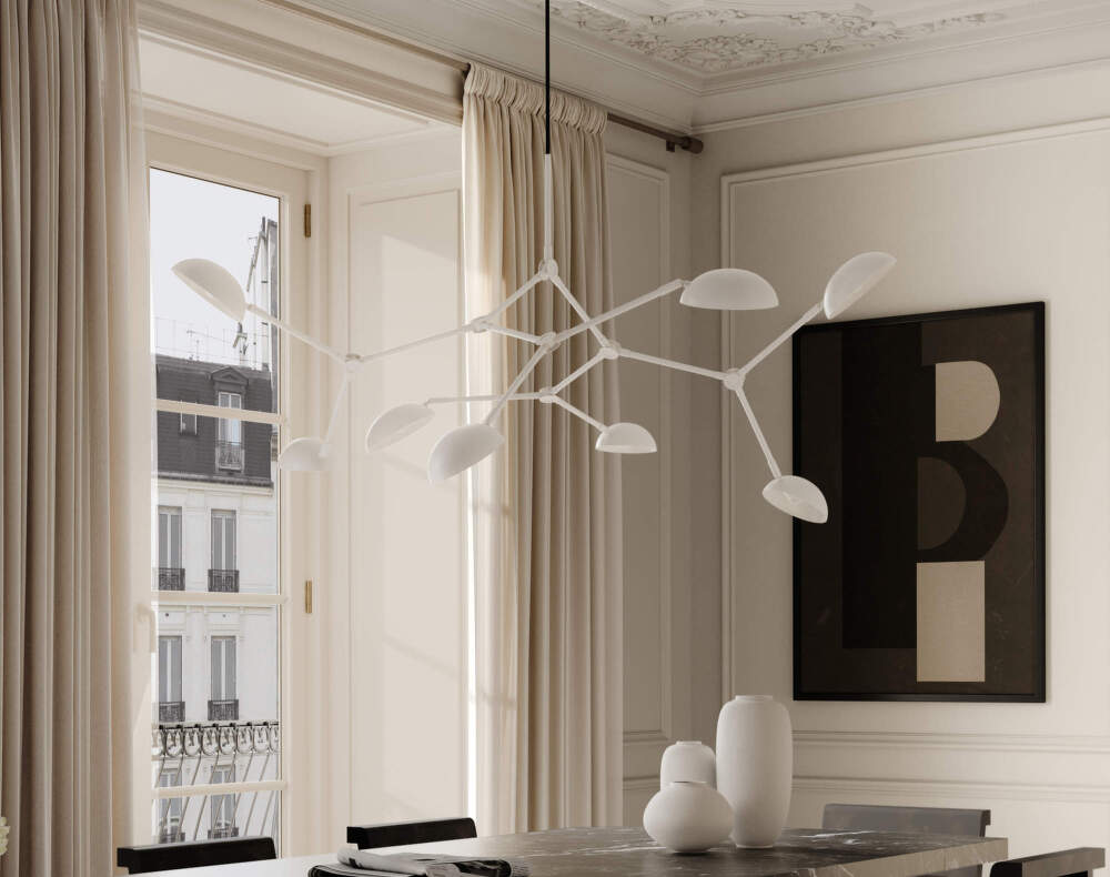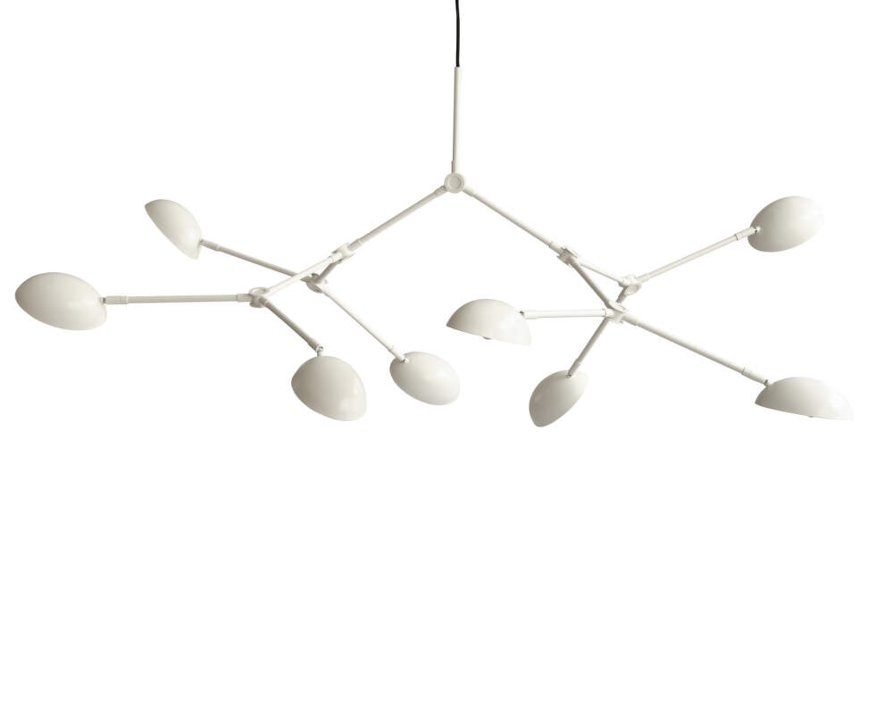 The Drop Big pendant light in white brings a subtle but distinctive light composition to the interior, combining a modernist aesthetic with playful variation. The organically shaped shades, inspired by 1950s design, look light and airy, while the 14 adjustable arms allow you to adjust the direction of the light and the overall expression of the luminaire. Variations of shapes can be created, from symmetrical compositions to playfully asymmetrical arrangements.
