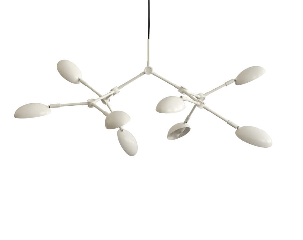The Drop Mini pendant light in white brings a subtle but distinctive light composition to the interior, combining a modernist aesthetic with playful variation. The organically shaped shades, inspired by 1950s design, look light and airy, while the 14 adjustable arms allow you to adjust the direction of the light and the overall expression of the luminaire. Variations of shapes can be created, from symmetrical compositions to playfully asymmetrical arrangements.