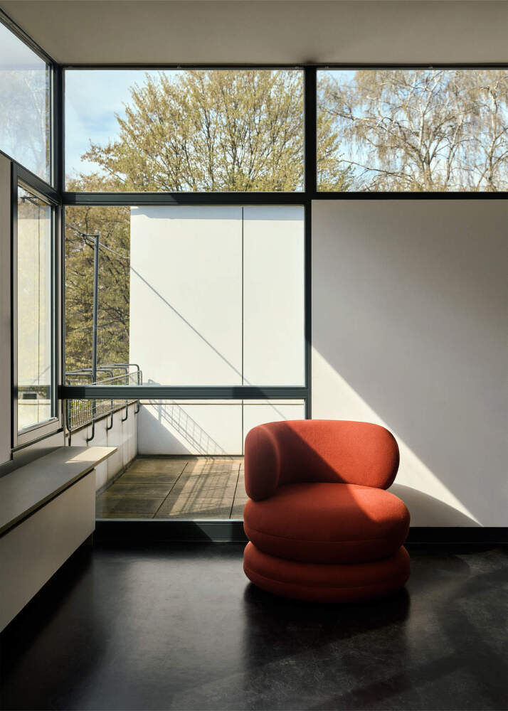 The wide U-shaped backrest is the defining feature, flowing naturally into the armrests and allowing comfortable seating in various positions. The three-part layered construction and circular shape give the chair a subtle sculptural quality without feeling heavy.