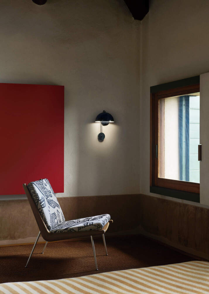 The wall lamp is part of the Flowerpot collection designed by Verner Panton. Its futuristic silhouette pushes the boundaries of conventional design. The lamp is made of painted aluminium and stainless steel and is available in many colours.