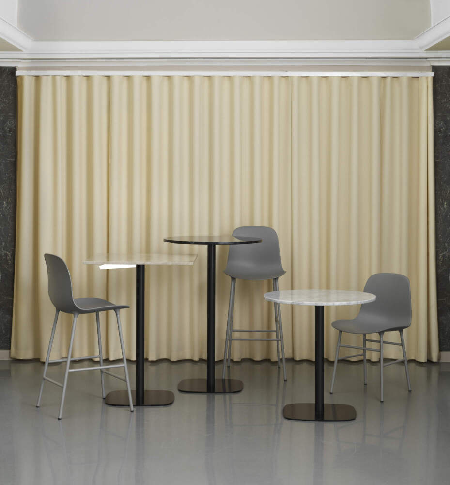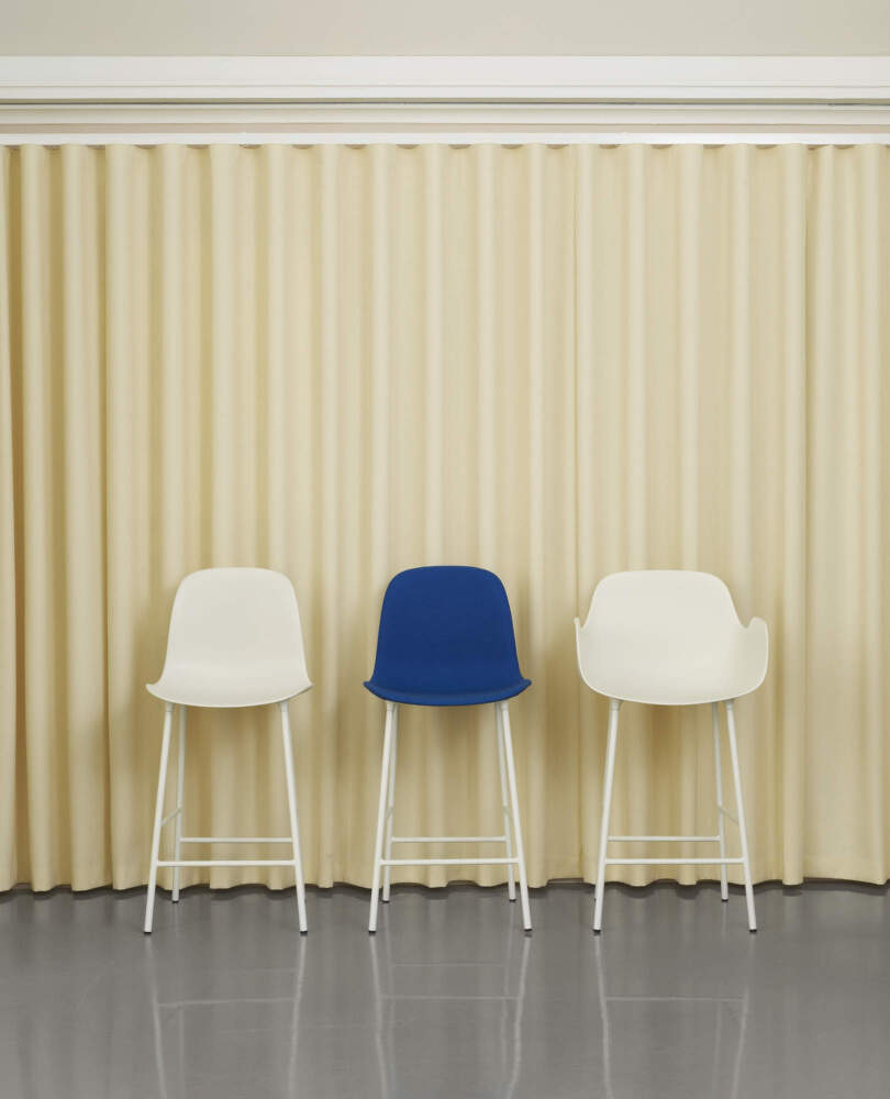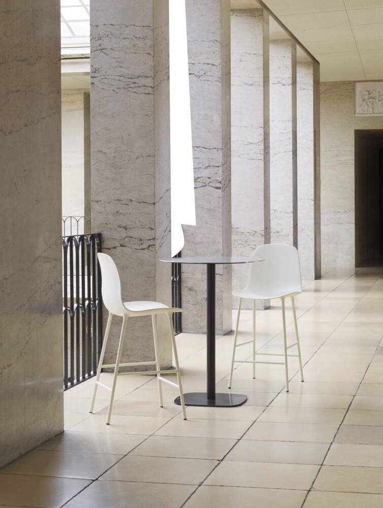 This bar stool, which stands on a lacquered steel base, was created by designer Simon Legald for Danish company Normann Copenhagen. He wanted to create stylishly uniform yet practical and functional pieces of furniture. The Form series stools will look great in the kitchen at the bar counter, for example. The seat made of moulded plastic has a soft and pleasant silhouette and therefore gives a clean and minimalist impression. Together with the steel base, it creates an interesting contrast and results in a light and subtle look. The chairs and stools from the Form range are highly durable and can withstand even the most demanding use, for example in restaurants or hotels. Thanks to the wide range of colours, everyone can easily choose the shade that best suits the interior.