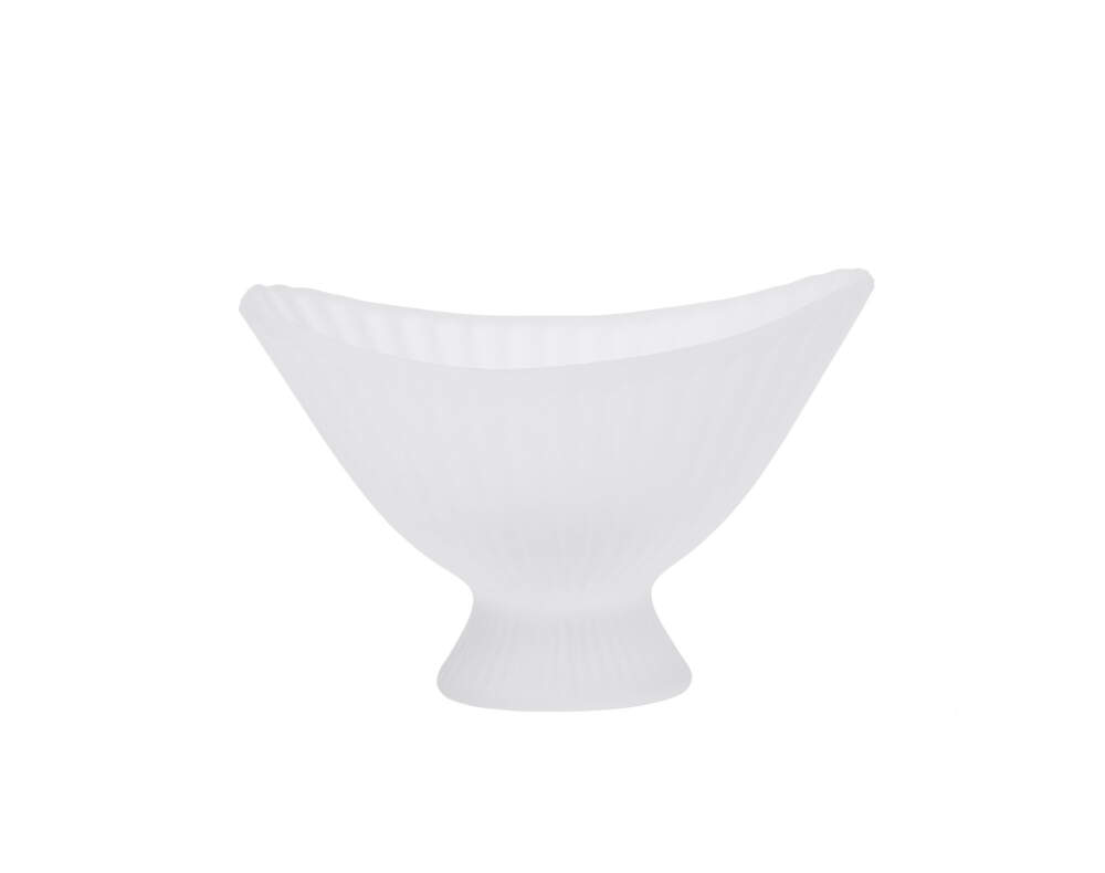 The bowl is made from hand-blown glass in a frosted finish, which is not fully transparent and softly allows light to pass through. This gives it a light appearance and allows it to stand out naturally as a decorative element in the interior.