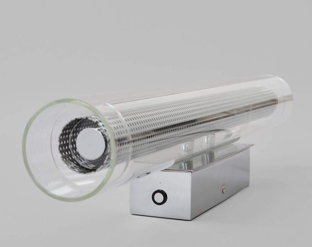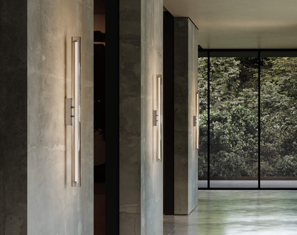 The Frame wall lamp works with the idea of framing light using layers of materials that create a distinctive yet subtle lighting effect. Perforated metal gives the lamp a light industrial character, while the outer cylindrical layer of clear glass softens it optically and emphasizes the fluidity of the entire shape. The contrast between the more sharply structured metal and the smooth glass creates a visual balance typical of the entire collection.
