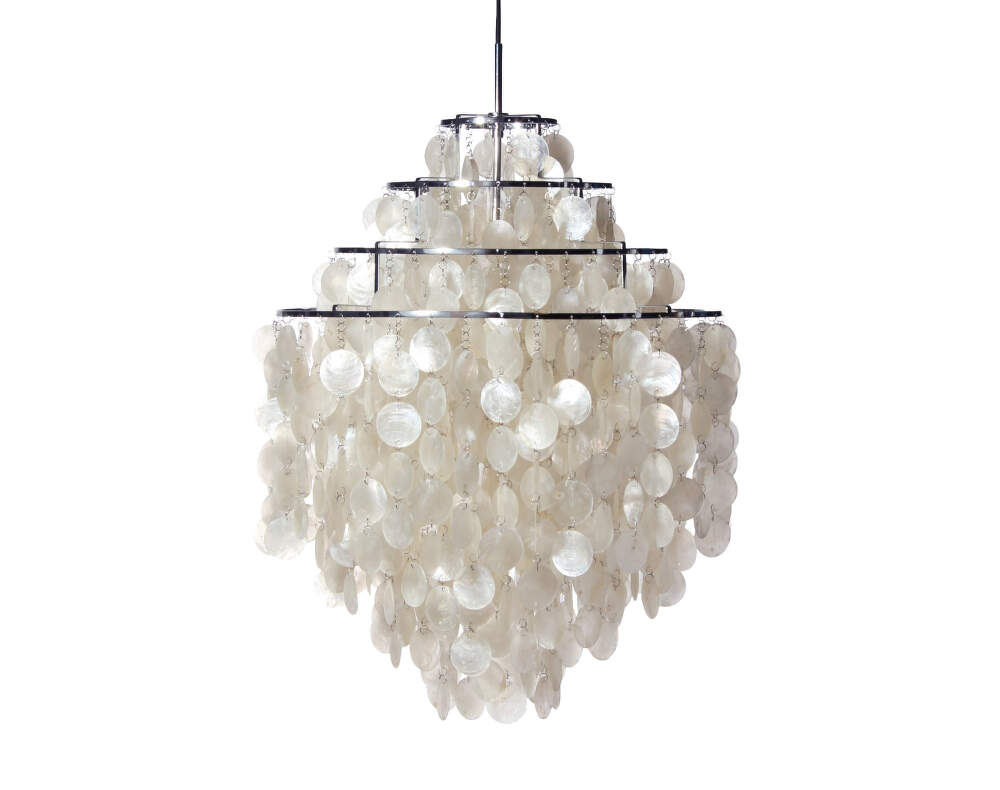 Its characteristic feature is the chains of mother-of-pearl shell discs suspended on metal rings. These gently filter the light and diffuse it into a soft, warm glow without glare. When moved by natural air flow, they produce a subtle, almost musical sound that enhances the lively character of the piece. The structure consists of a chrome frame with carefully crafted details, creating a contrast between technical construction and the organic texture of the shells.