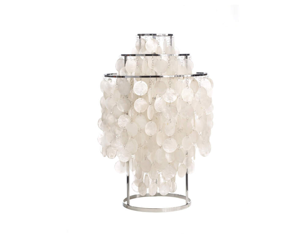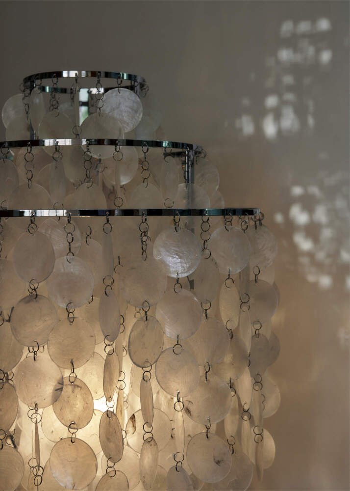 Chains of mother-of-pearl shell discs suspended from a metal structure filter the light into a soft, warm glow without glare. When gently moved, they create a delicate sound that adds a lively and sensory dimension to the lamp. The chrome frame highlights the contrast between precise construction and the organic texture of the shells.