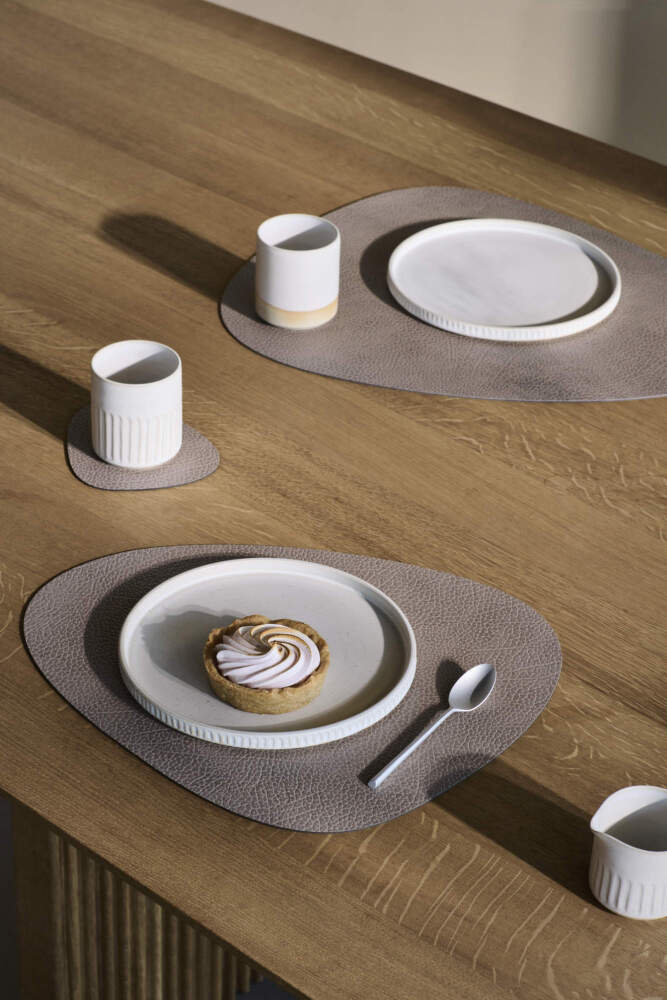 Add a touch of elegance to your table with these iconic glass mats and placemats from Lind DNA. Not only aesthetically pleasing, but also environmentally friendly, these glass mats made of recycled OEKO-TEX® leather were, before becoming a practical accessory for every dining table, a surplus production from shoes, bags and belts. The mats are available in both organic and square shapes in several sizes with different textures and in a plethora of beautiful colours. The Glass Mat Curve creates perfect harmony especially in combination with the same shaped placemats and stoneware from the Curve collection.