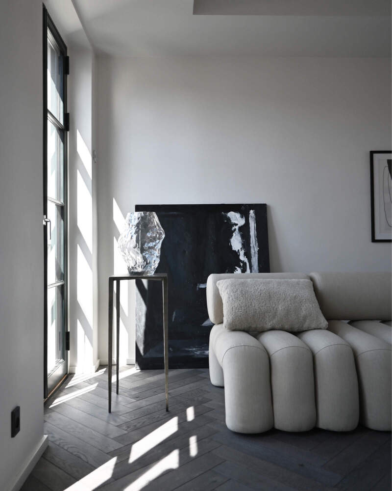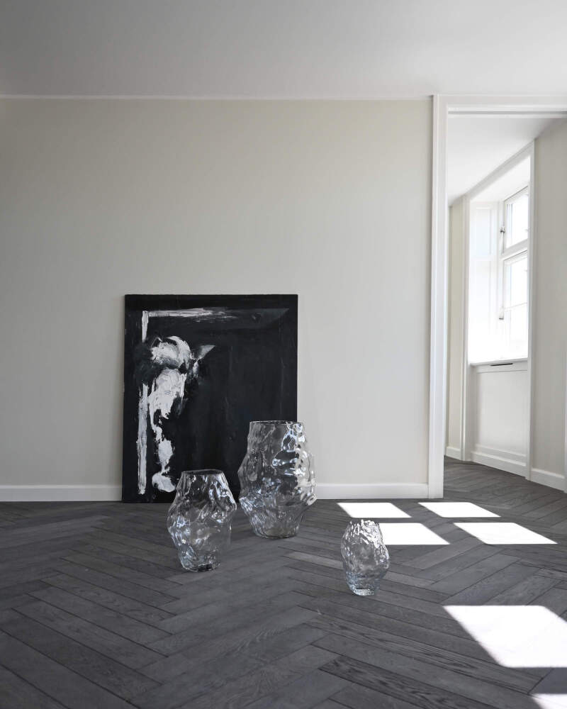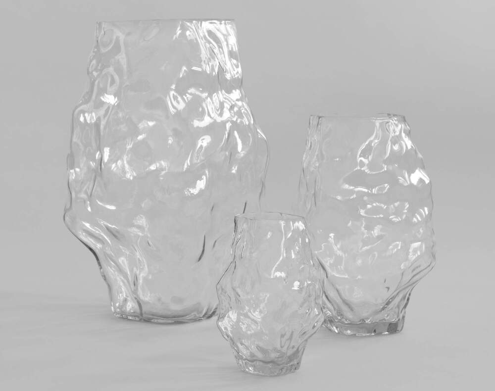 The Karachi Medio vase is the medium version in the collection, which explores the interplay of shape, light, and material. It is made of hand-blown glass with a slightly irregular surface that refracts light and scatters it into soft reflections.
