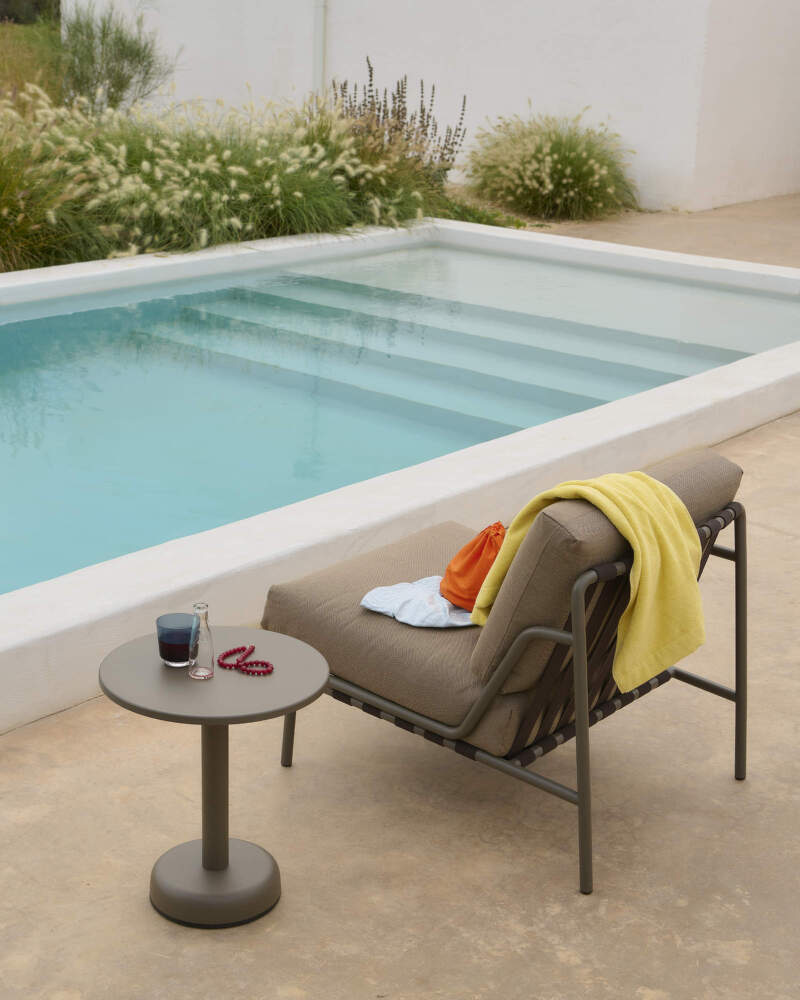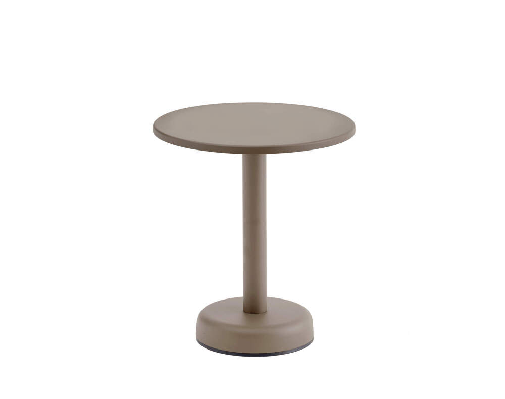 Linear Steel Coffee Table with diameter 42 cm from collection of modern outdoor furniture was created by designer Thomas Bentzen for Danish brand Muuto. Colour: taupe.