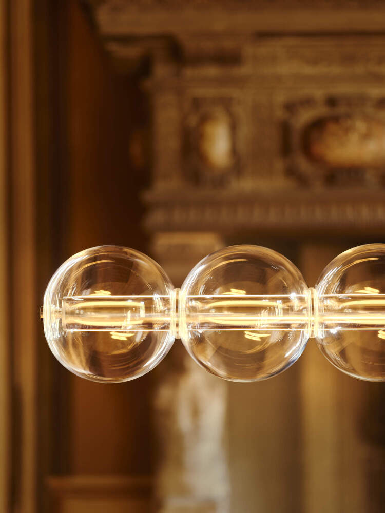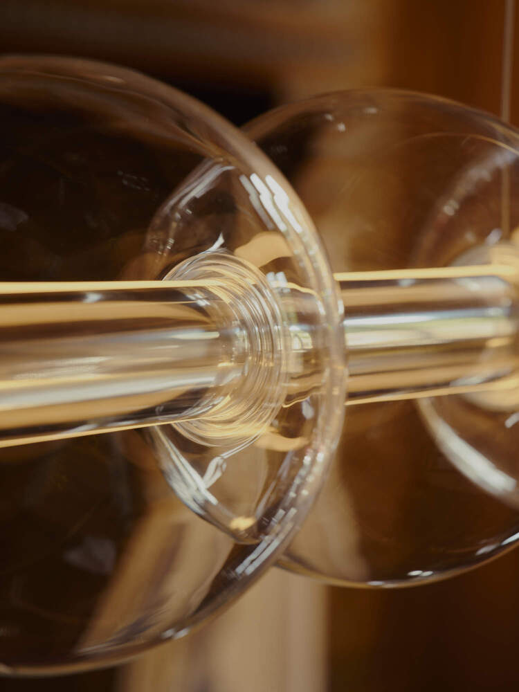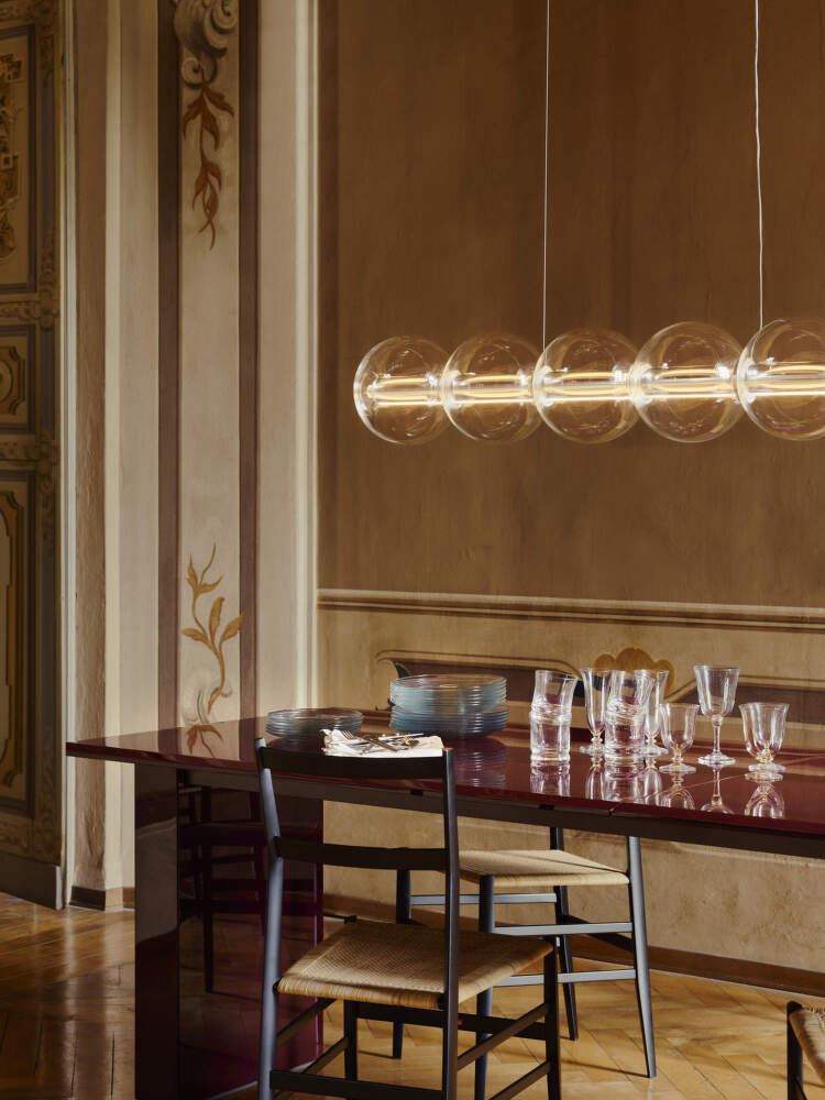 The Luce Sferica pendant light captivates with its combination of precise technical workmanship and delicate glass details. The aluminium body is surrounded by a series of hand-blown glass spheres that diffuse light into the space and give the light fixture lightness and character.