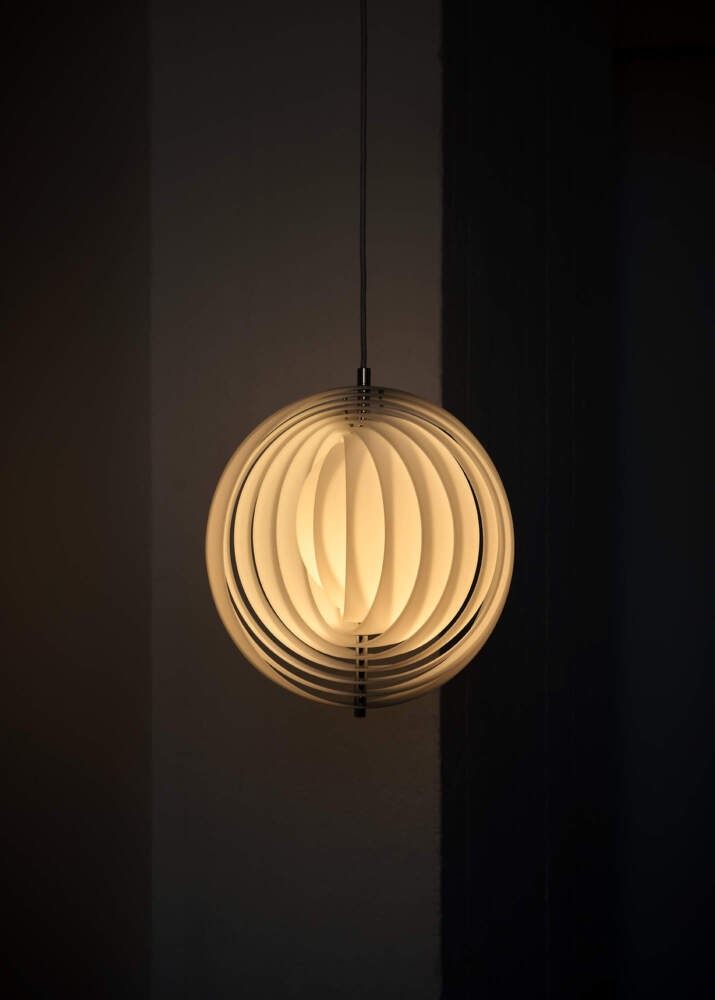 The Moon pendant light in opal is based on Verner Panton’s early design from 1960 and represents one of the purest expressions of his work with light as a form-defining element. The characteristic fan-like arrangement of ten circular lamellae creates a dynamic silhouette that changes depending on the viewing angle, adding visual depth to the space.