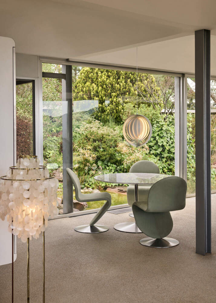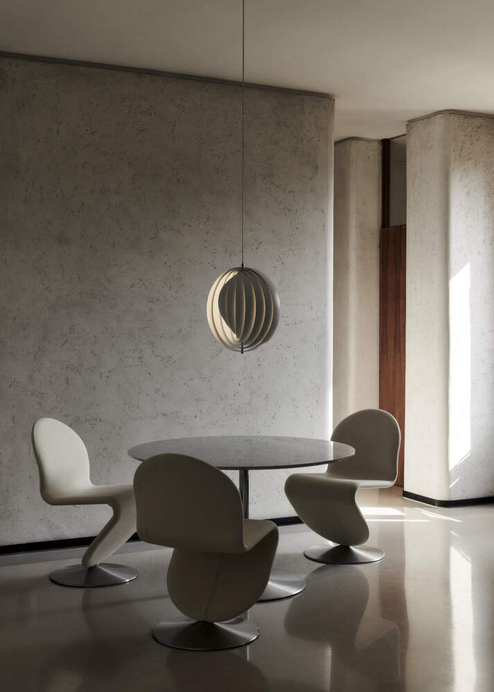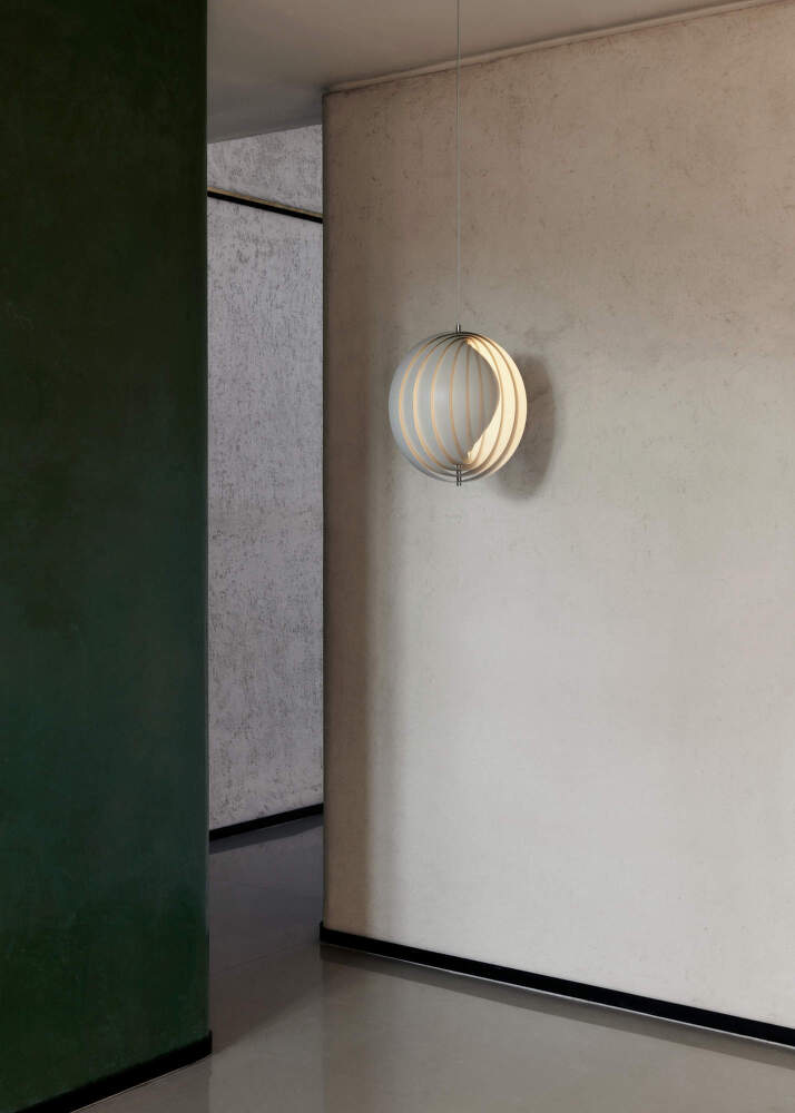 The Moon pendant light in opal is based on Verner Panton’s early design from 1960 and represents one of the purest expressions of his work with light as a form-defining element. The characteristic fan-like arrangement of ten circular lamellae creates a dynamic silhouette that changes depending on the viewing angle, adding visual depth to the space.