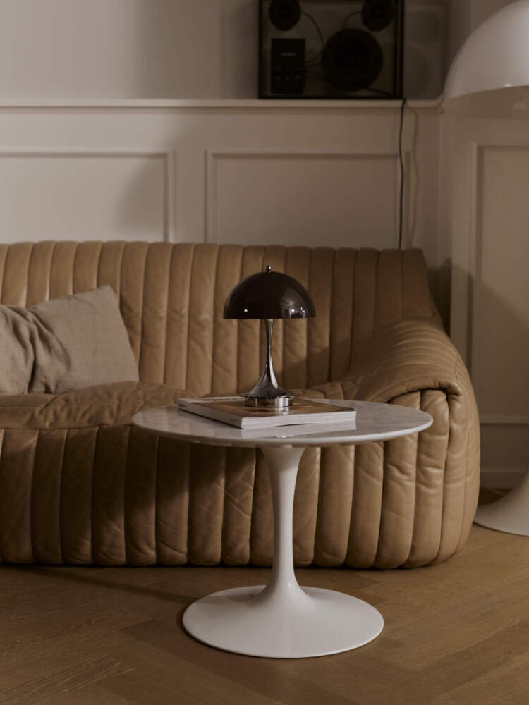 Made from recycled materials, the Panthella 160 V3 combines sustainability with cutting-edge technology. USB-C charging and an elegant light indicator ensure ease of use, while the timeless design references the heritage of Danish modernism.