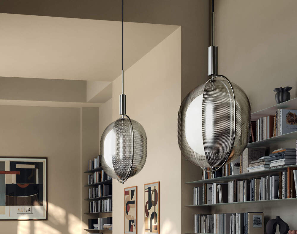 The Pearl pendant lamp combines soft, diffused light with a distinctive but balanced form. The opal glass shade produces a soft glow that is partially filtered by the perforated metal casing, giving the light a subtle texture and depth.