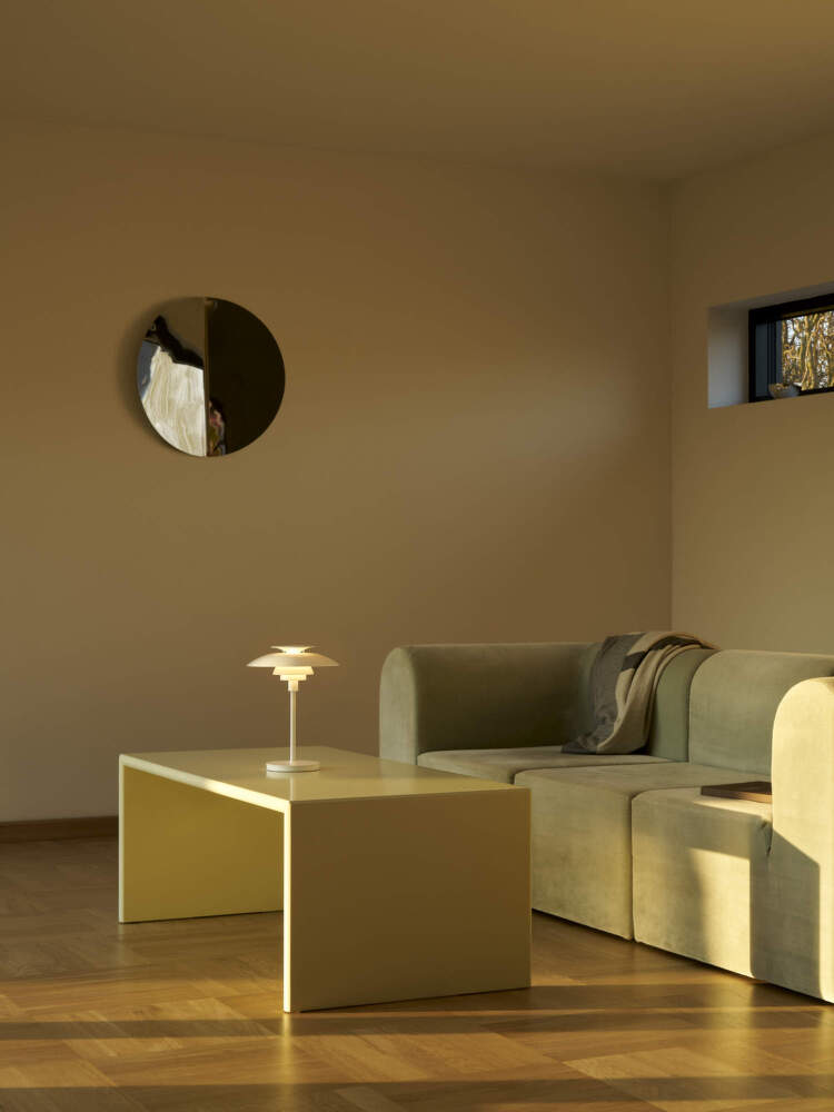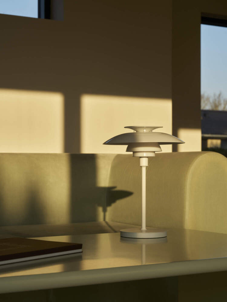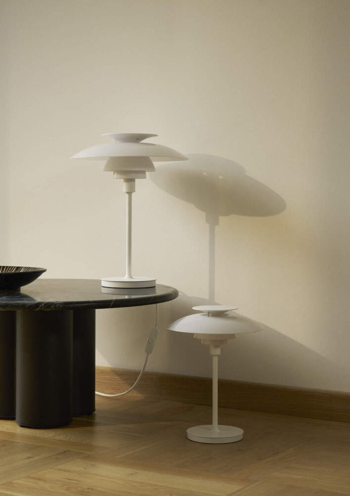 The PH 80 portable lamp continues the timeless legacy of Danish designer Poul Henningsen and his iconic three-shade system, which ensures even light without glare.