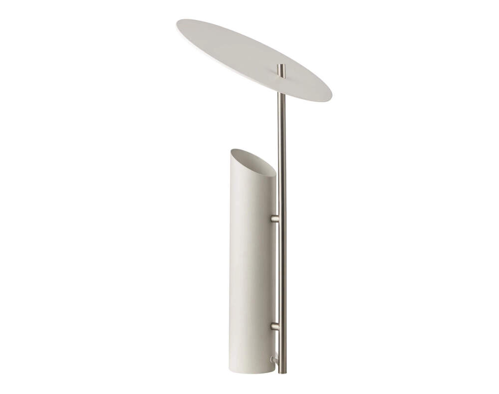 The light rises from the tubular base and strikes the white surface of the shade, from where it is softly diffused into the surroundings. All parts of the lamp are made of steel with a powder-coated finish, while the vertical stem features a satin finish.