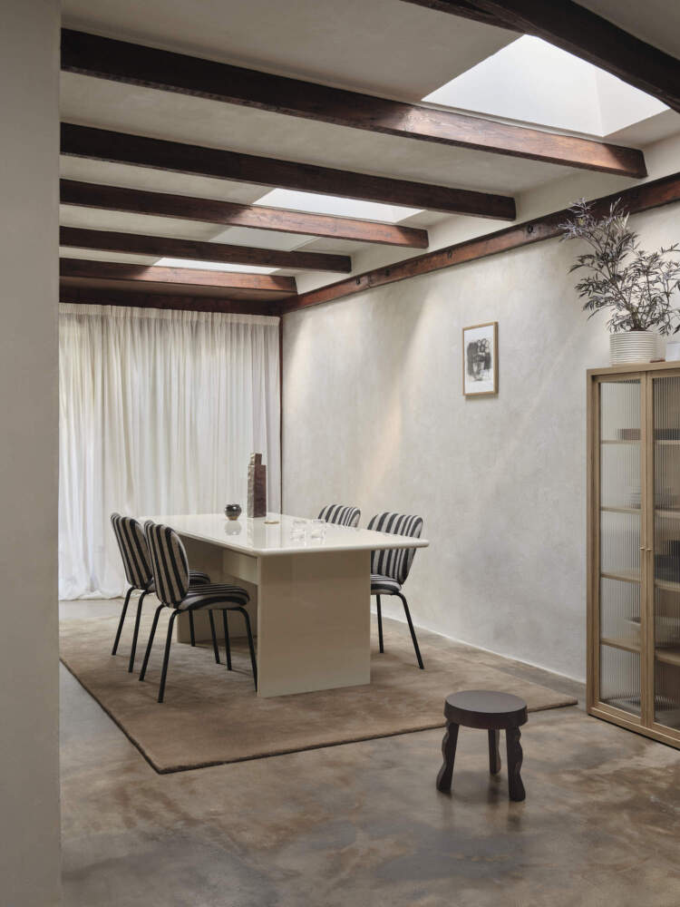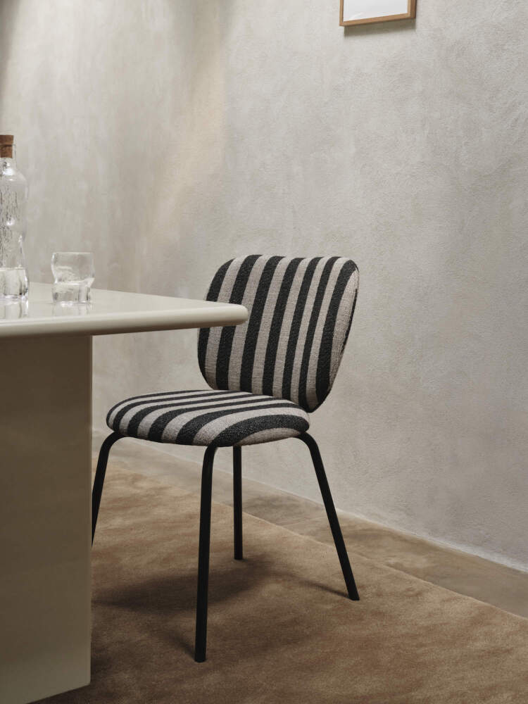 The Louisiana upholstery was developed in collaboration with the Louisiana Museum of Modern Art. The striped pattern draws inspiration from the graphic lines and modernist architecture of this iconic location, referencing the characteristic wooden slats and black window frames of the building. The wool-based textile has a pleasantly textured surface and combines muted tones that give the chair a timeless yet distinctive look.