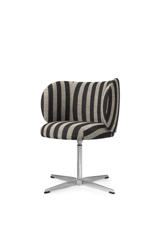 Design dining chair with swivel base from Rico collection by Ferm Living. Version: polished aluminium base, Louisiana fabric in sand/black colour.