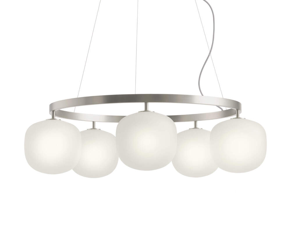 The Rime chandelier develops the distinctive design of the collection into a bold, spatially expressive form. Five hand-blown glass shades create a balanced composition that functions not only as a source of light but also as a striking focal point within the interior. The light provides soft, evenly diffused illumination while acting as an elegant lighting installation.