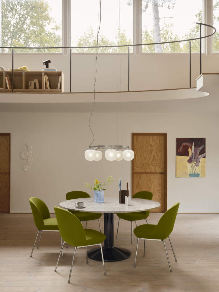 Thanks to its proportions, the Rime chandelier is an ideal choice for spaces with higher ceilings. It stands out beautifully above dining tables, in dining areas, entrance halls or representative communal spaces. The Rime chandelier is available in several colour options and pairs effortlessly with other lights from the collection.