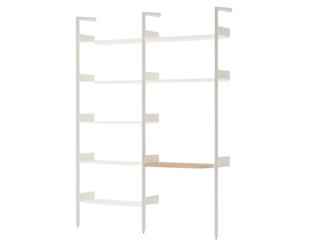 Rombe Configuration B combines a classic shelving solution with an integrated desk, making it the ideal choice for home offices or creative work areas. This variant allows for a seamless connection between storage and work space in a single unit.