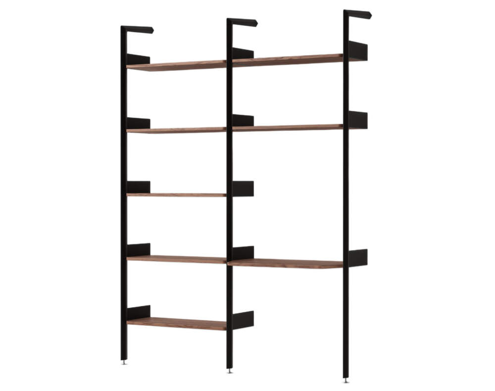 Minimalist Rombe shelving system in configuration B (IF1+IF5) with work desk, created for Danish brand &Tradition by Industrial Facility. Finish: anthracite brackets, water-based lacquered walnut shelves and work desk.
