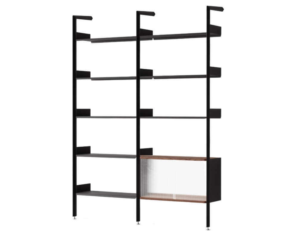 Rombe Configuration C combines open shelves with a closed cabinet fitted with sliding doors made of reed glass, which let light through but at the same time provide discreet cover for stored items. It is ideal for the living room, where it offers space both for displaying and hiding things that should not be visible.