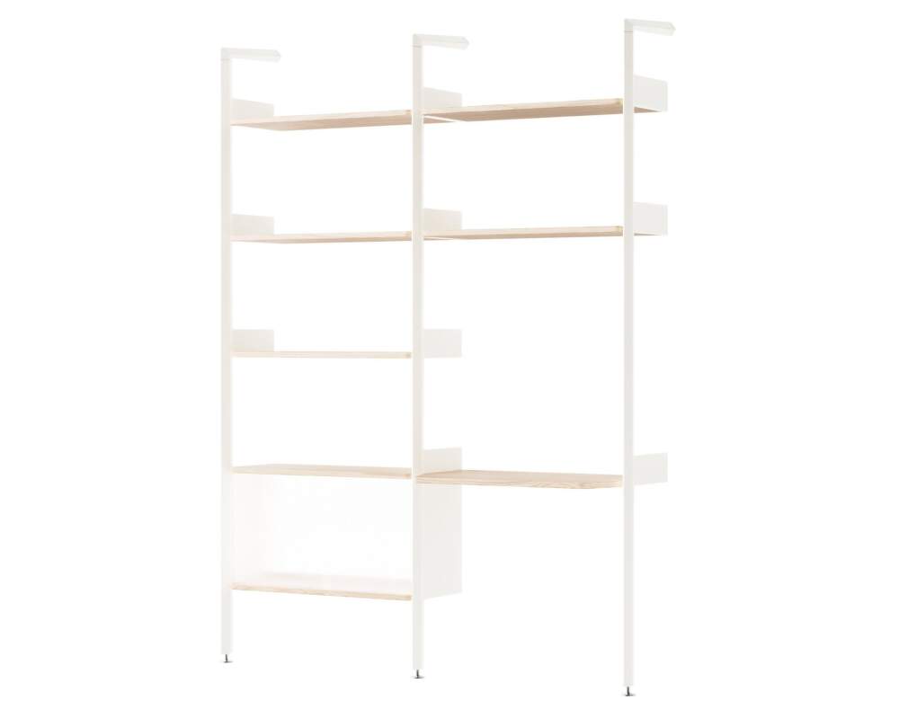 Minimalist Rombe shelving system in configuration D (IF3+IF5) with work desk and cabinet, created for Danish brand &Tradition by Industrial Facility. Finish: alabaster brackets, water-based lacquered oak shelves.