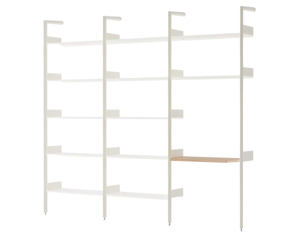 Minimalist Rombe shelving system in configuration G (IF1+IF4+IF5) with work desk, created for Danish brand &Tradition by Industrial Facility. Finish: alabaster brackets and shelves, water-based lacquered oak work desk.