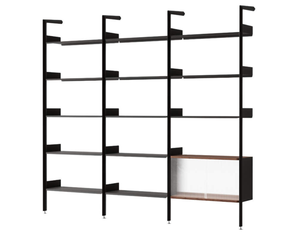 Rombe Configuration H combines open shelves with a closed cabinet fitted with sliding doors made of reed glass, which let light through but at the same time provide discreet cover for stored items. It is ideal for the living room, where it offers space both for displaying and hiding things that should not be visible.
