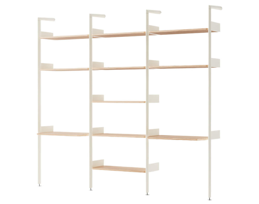 Minimalist Rombe shelving system in configuration I (IF2+IF4+IF5) with two work desks, created for Danish brand &Tradition by Industrial Facility. Finish: alabaster brackets, water-based lacquered oak shelves and work desks.