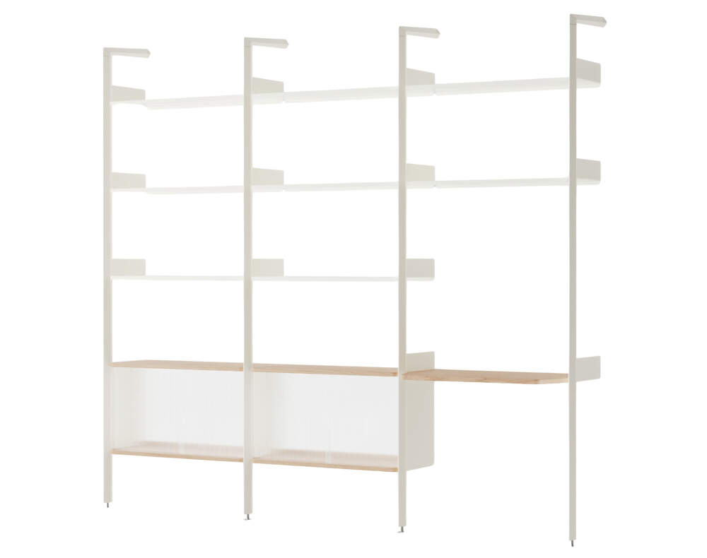 Minimalist Rombe shelving system in configuration J (IF3+IF6+IF5) with two cabinets and work desk, created for Danish brand &Tradition by Industrial Facility. Finish: alabaster brackets and shelves, water-based lacquered oak work desk.