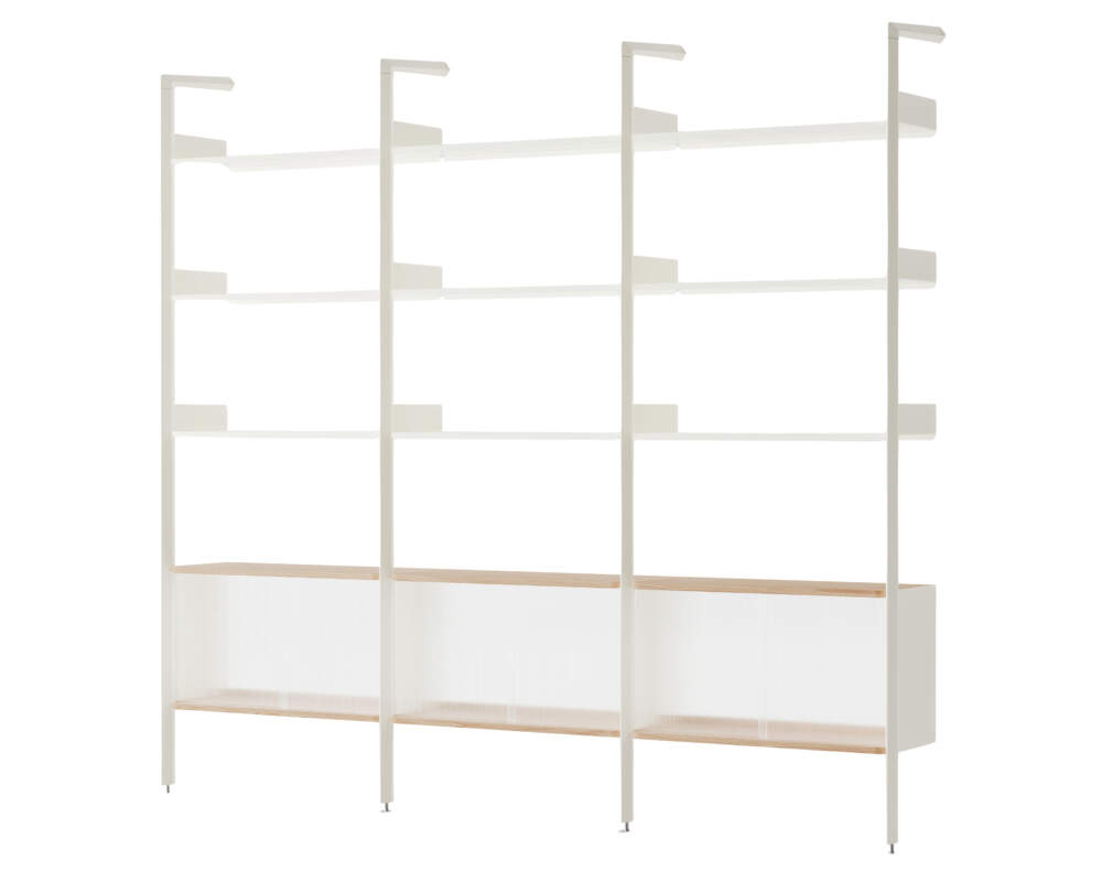 Minimalist Rombe shelving system in configuration K (IF3+IF6+IF6) with three cabinets, created for Danish brand &Tradition by Industrial Facility. Finish: alabaster brackets and shelves.