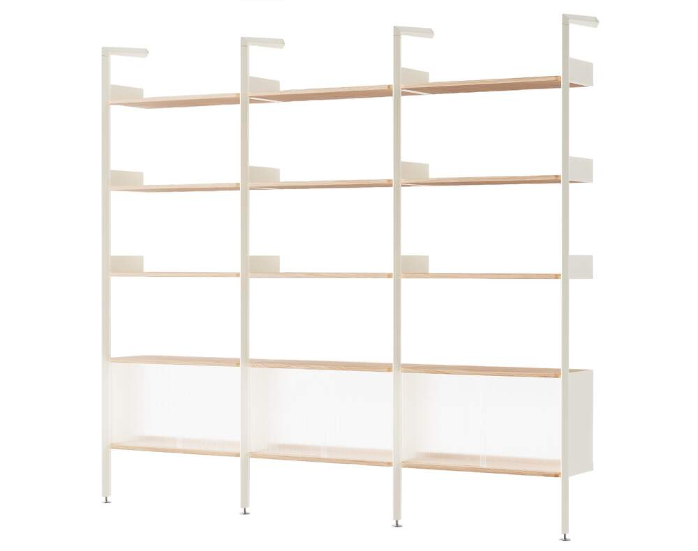 Minimalist Rombe shelving system in configuration K (IF3+IF6+IF6) with three cabinets, created for Danish brand &Tradition by Industrial Facility. Finish: alabaster brackets and water-based lacquered oak shelves.