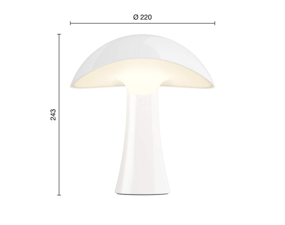 The lamp combines soft, diffused light with a durable injection-molded polymer construction. It features three-step dimming (10% / 33% / 100%), making it easy to change the intensity of the lighting to suit your mood and situation. The rechargeable lithium-ion battery provides up to 5 hours of operation at full brightness and is recharged via a USB-C cable. A light on the base glows softly during charging.
