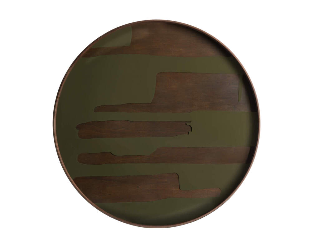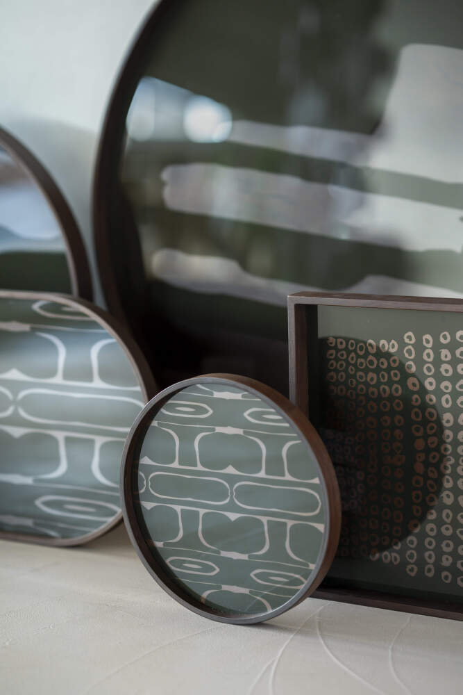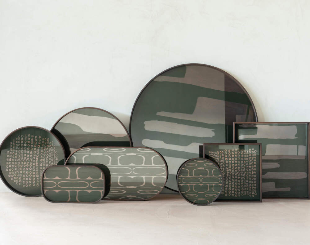 The colour palette features mossy green tones complemented by subtle metallic accents, adding depth and understated elegance to the glass surface. Designed by Dawn Sweitzer, the trays are created to pair beautifully with the tables and other trays from the Tray collection.