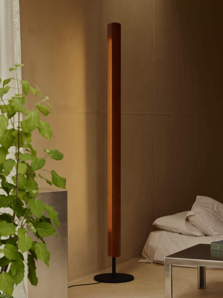 Originally designed by Tobia Scarpa in 1963, the Seki-Han floor lamp represents a unique combination of craftsmanship, modern technology and precision workmanship. Two vertical ash wood blades, connected by chrome-plated metal elements, surround the central tubular light source. The blades can be rotated around their axis to change the intensity and direction of the light, from a soft diffusion to a concentrated beam. This movement creates a dynamic play of light and shadow and allows the user to fully influence the atmosphere of the space.
