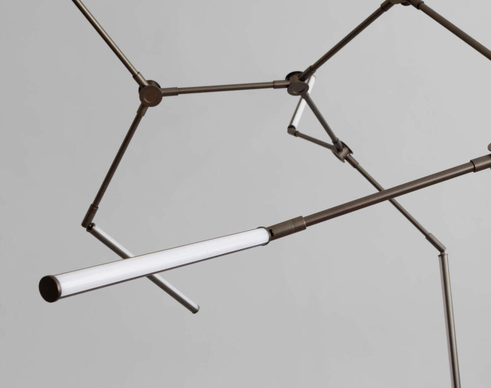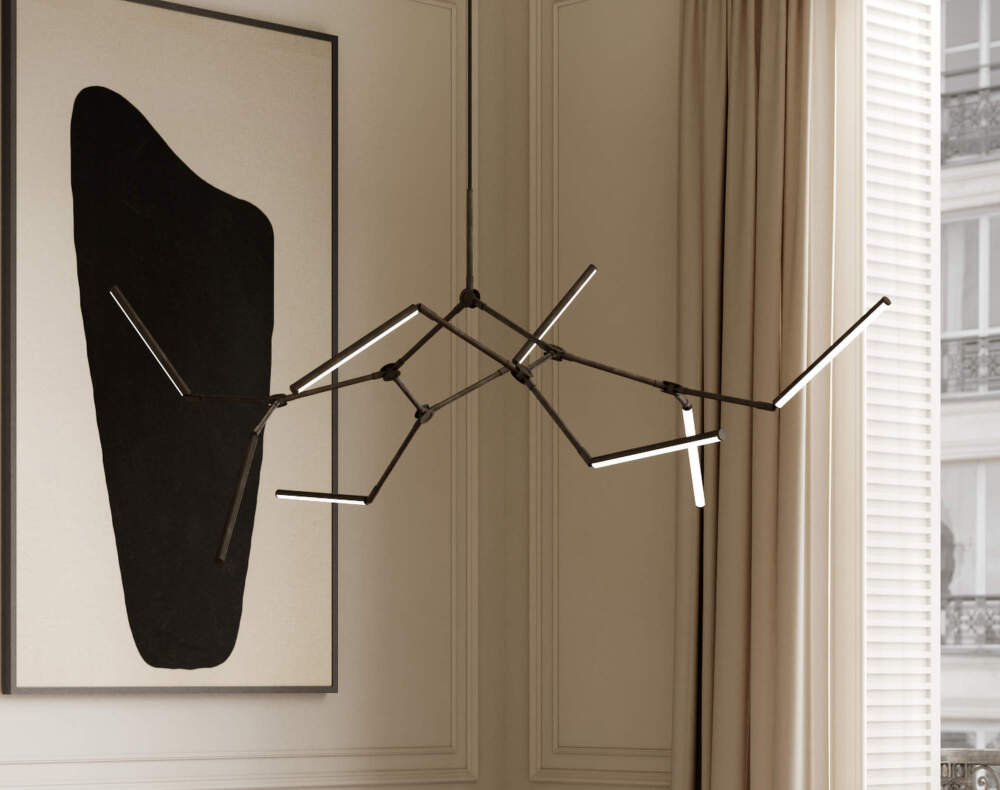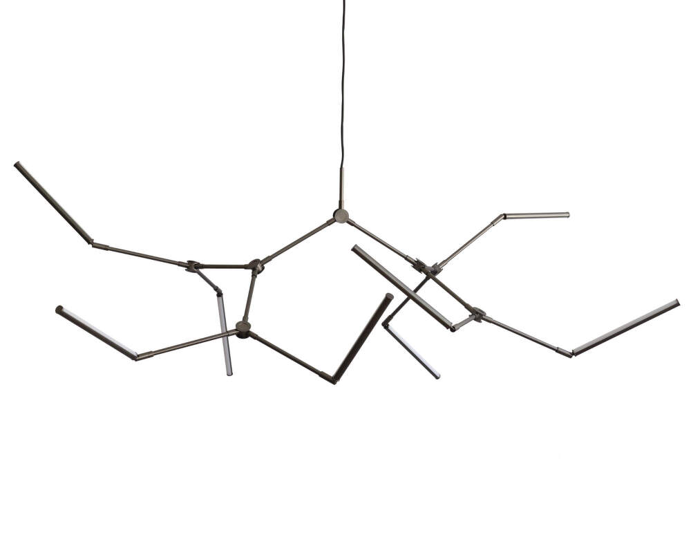 The 2400 K light creates uniform, soft lighting with a pleasant atmosphere. Thanks to the swivel joints, the individual light units can be freely directed to create symmetrical and expressive compositions. The Stick chandelier can be connected to a dimmable system that allows the light intensity to be regulated.