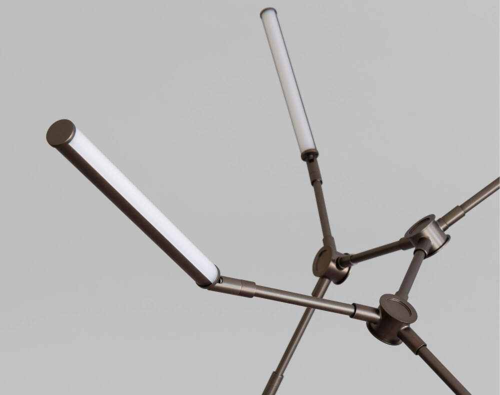 The Stick Mini chandelier is a smaller version of the Stick collection, which combines light, geometry, and technical precision. The luminaire's structure consists of eight adjustable metal arms with a brushed bronze finish, at the ends of which are opal acrylic light units with integrated LED sources.