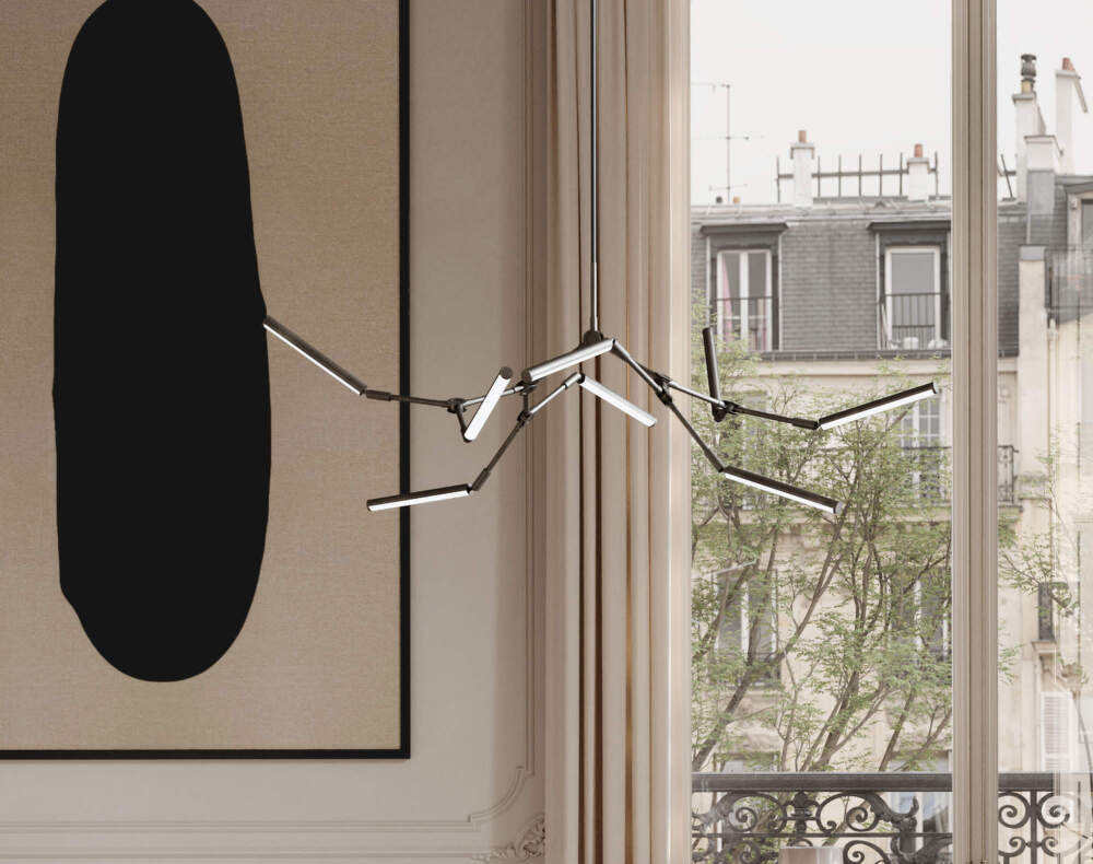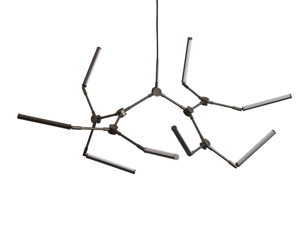 The 2400 K light creates uniform, soft lighting with a pleasant atmosphere. Thanks to the swivel joints, the individual light units can be freely directed to create symmetrical and expressive compositions. The Stick chandelier can be connected to a dimmable system that allows the light intensity to be regulated.