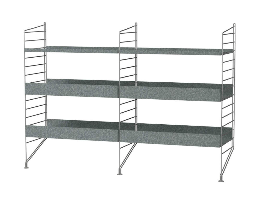 The galvanised steel construction is designed for outdoor use and stands out for its durability as well as its natural ability to develop a characteristic patina over time. The combination of shelves with different edge heights adds both functionality and visual interest, allowing for flexible use depending on your needs.
