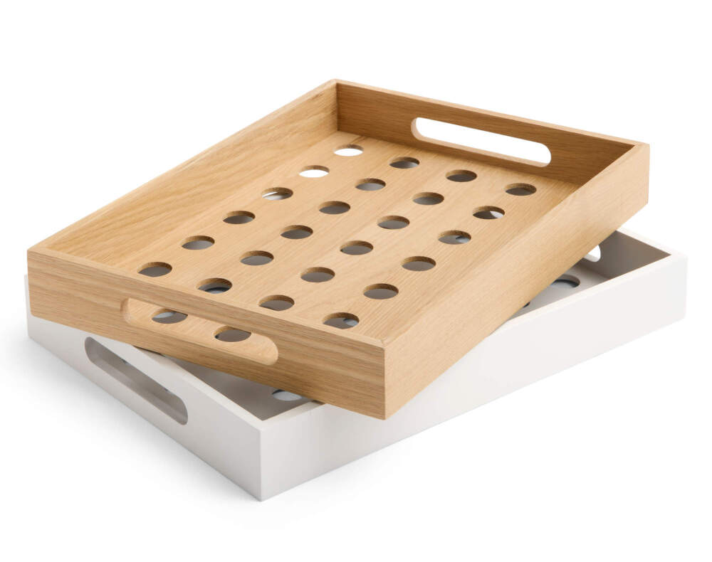 The tray is made from durable oak wood with a high-quality surface finish that ensures long-lasting use and easy maintenance. The perforated base lightens the overall appearance while also enhancing practicality. The construction is stable and suitable for frequent use when serving or storing items.