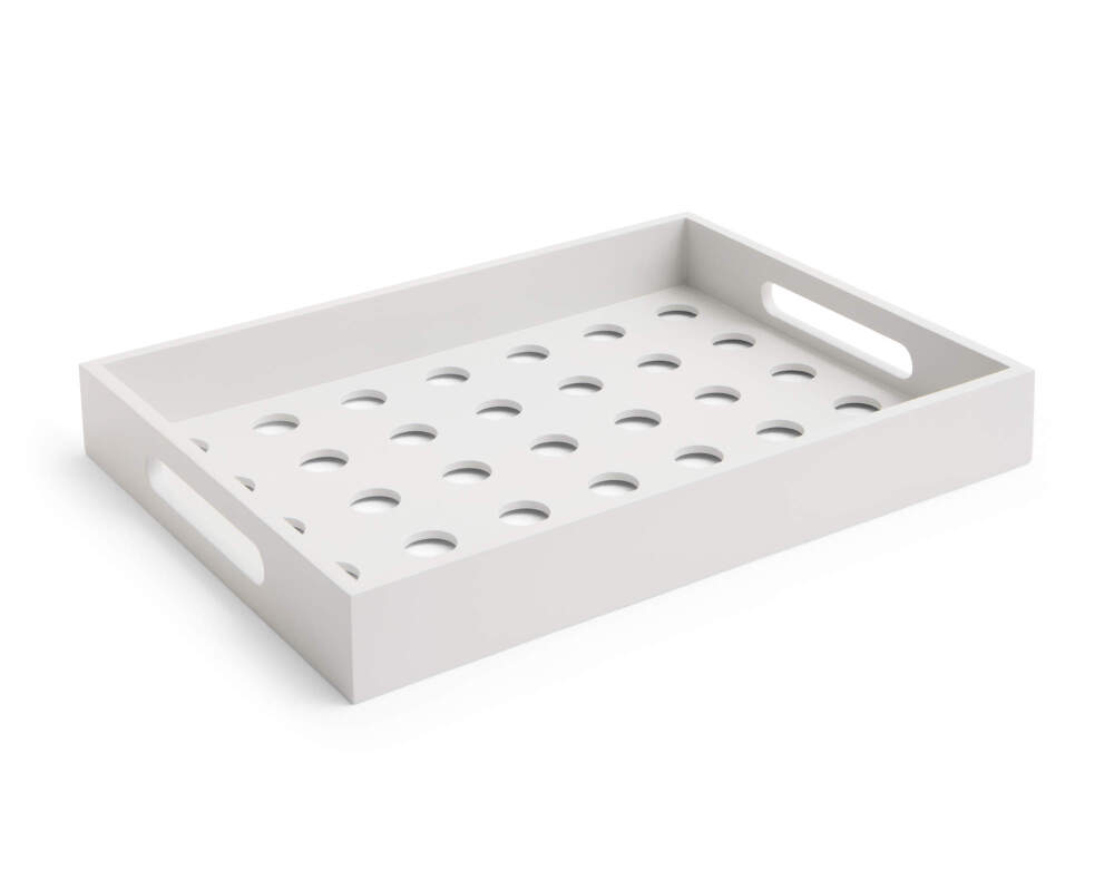 The Terrazza dot tray is a practical accessory designed for everyday use both indoors and outdoors. Its simple, functional form is complemented by a perforated base, raised edges and cut-out handles, making it easy to handle and carry.