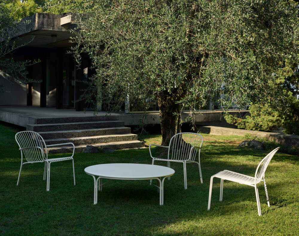 The steel furniture with grid seating feels airy and light and has a soft inviting silhouette that plays with light and shadow. The collection consists of chairs, armchairs and tables in muted, understated colors. Versatility, comfort and stability are the key. Seat pads and cushions are available for extra comfort. Thorvald finds its place in outdoor bistros or cafes as well as on private terraces and gardens.