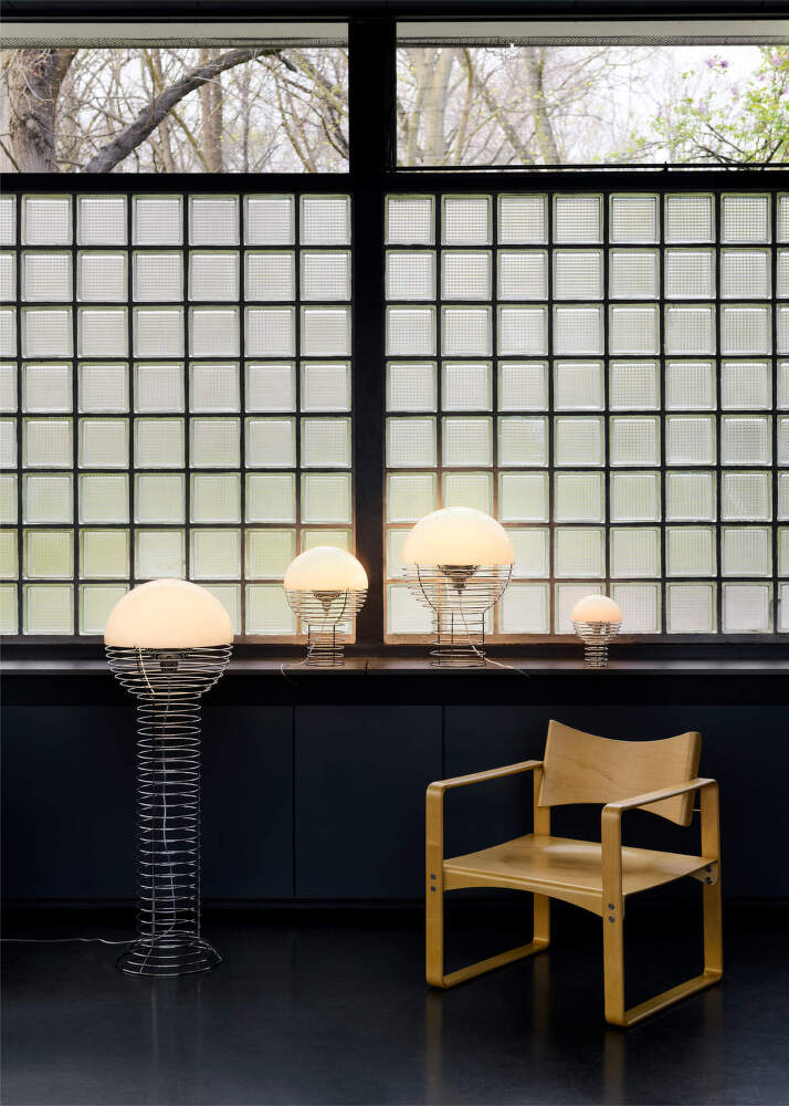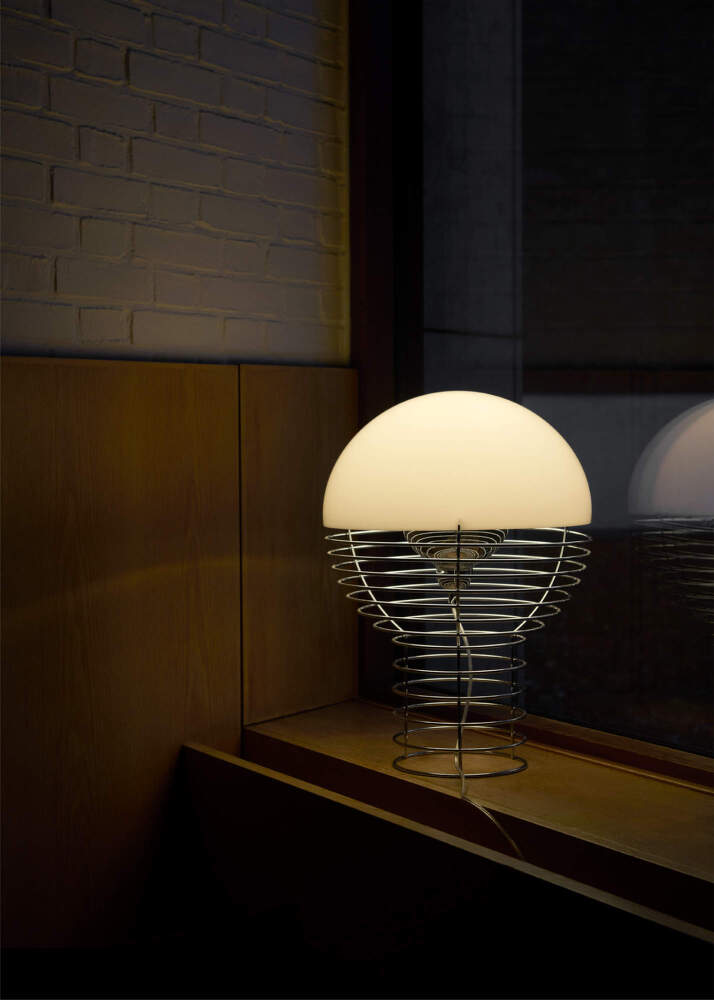 The Wire table lamp is one of Verner Panton’s iconic designs from the early 1970s and represents an experiment with steel wire in its purest form. The open chrome-plated wire construction creates a light and geometrically precise silhouette. Here, light is not merely a functional element but becomes the main protagonist of the space.